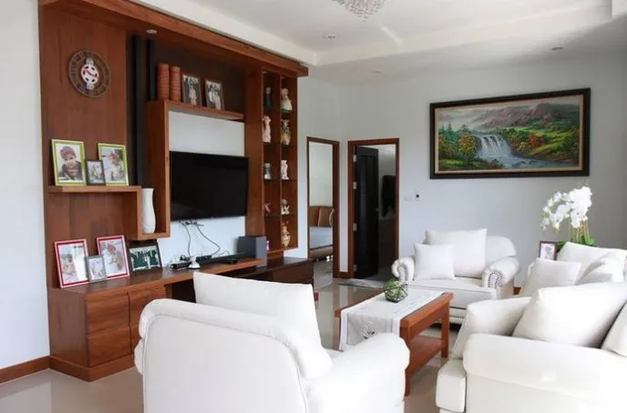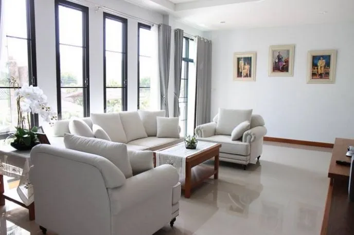 ส่วนข้างในบ้านหลังนี้ เน้นสีที่เป็นโทนสีขาว ทำให้ดูสว่างและสะอาดตา ทำความสะอาดได้ง่าย ด้านฝ้าผนังด้านบน เป็นแบบฝ้าหลุม ตกแต่งด้วยโครมไฟ พร้อมทั้งยังมี อุปกรณ์ เฟอร์นิเจอร์ ที่ครบคั่น ทั้งโซฟาและชั้นไม้ สำหรับวางสิ่งของที่ต้องการโซว์ ให้แขกผู้มาเยือนได้เห็น ถึงความสวยงาม ภายในตัวบ้าน