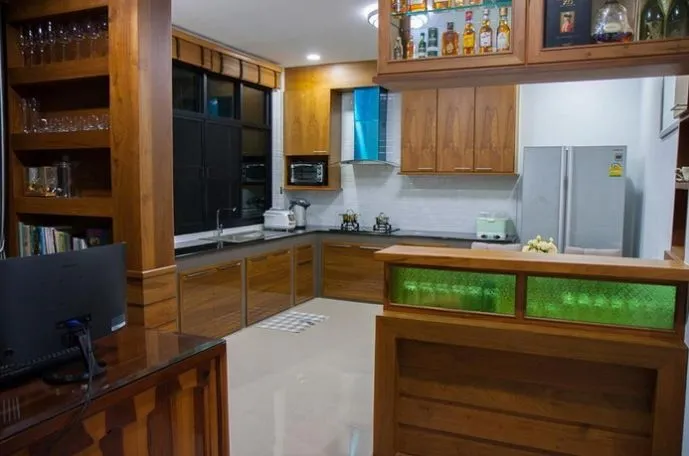 สำหรับห้องครัวเป็นการเลือกใช้ บิ้วอิน ด้วยเฟอร์นิเจอร์ ที่ส่วนใหญ่ทำจากไม้ เกือบทั้งหมด ซึ่งทำให้ภายในห้องครัว ดูเป็นธรรมชาติ และคลาสสิกสวยงาม อุปกรณ์ที่ใช้ในการประกอบอาหาร ก็ครบ อีกทั้งยังมีเครื่องระบายอากาศ ในขณะที่เราประกอบอาหาร ซึ่งช่วยให้กลิ่นของอาหาร ถูกดูดออกไปยังภายนอก