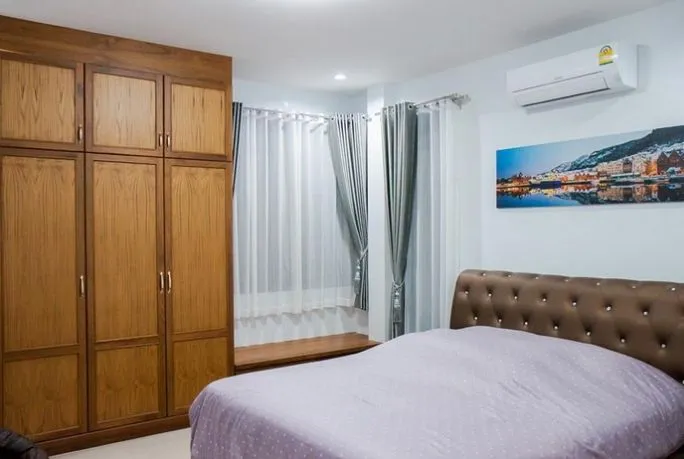 ใช้จัดเก็บเสื้อผ้า และสิ่งของอื่นๆได้เป็นจำนวนมาก หากมองดีๆ แล้ว ห้องนอนบ้านหลังนี้ ก็ดูเป็นโรแมนติค ไม่น้อยเลยที่เดียว นะครับ