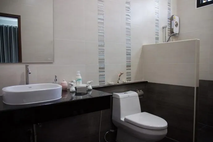 อีกห้องที่ขาดไม่ได้ คือห้องน้ำ ที่บ้านทุกหลังต้องมี ด้านดีไซน์ในส่วนของห้องน้ำ แยกสัดส่วน ด้านเปียกและพื้นที่แห้งออกจากกัน เน้นสีของกระเบี้อง ในแบบทูโทนขาวดำ เพิ่มความสวยงาม อีกทั้งยังมีเครื่อง สุขภัณฑ์ ที่ครบถ้วน ทำให้บรรยากาศ ในการใช้ห้องน้ำ รู้สึกผ่อนคลายและมีความสุข