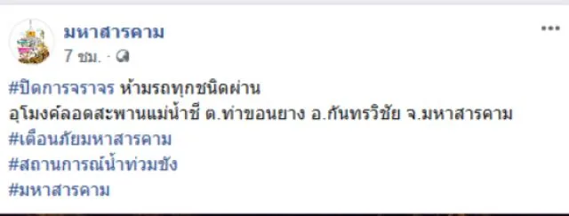 เรียกได้ว่าน้ำท่วมหนักมากสำหรับจังหวัด มหาสารคาม เมื่อวันที่ 30 สิงหาคม เพจ มหาสารคาม ได้โพสต์ข้อความเตือนระบุข้อความว่า ปิดการจราจร ห้ามรถทุกชนิดผ่าน อุโมงค์ลอดสะพานแม่น้ำชี ต.ท่าขอนยาง อ.กันทรวิชัย จ.มหาสารคาม เตือนภัยมหาสารคาม สถานการณ์น้ำท่วมขัง มหาสารคาม