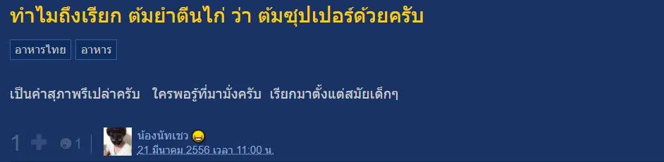 ซึ่งถือว่าเป็นข้อมูลที่ค่อนข้างละเอียดมากเลยทีเดียว ทีนี้ก็หายสงสัยกันซะทีนับว่าเป็นอีกหนึ่งเมนูที่นอกจะอร่อยแล้วยังมีตำนานเรื่องเล่าที่เป็นเรื่องเป็นราวกว่าจะมาเป็นต้มซุปเปอร์มีมาหลายชื่อเลยก็ว่าได้ เป็นความรู้เล็กๆ น้อยๆ ที่นำมาฝากเพื่อนๆ