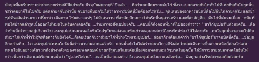 ต่อมาก็มีสมาชิกหมายเลข 1445693ให้ข้อมูลว่า "ที่ผมรับทราบมาประมาณร่วม40ปีแล้วครับ ปัจจุบันผมอายุ61ปีแล้ว......คือว่าเคยมีคนขายต้มไก่ ซึ่งจะแปลกจากต้มไก่ทั่วไปที่เคยกินกันในยุคนั้น จะว่าต้มยำก็ไม่ใช่ครับ แต่คล้ายๆกันเท่านั้น คนขายก็บอกไม่ได้ว่าอาหารชนิดนี้มันคืออะไรครับ....จุดเด่นของอาหารชนิดนี้คือใช้ตีนไก่ล้วนๆครับ และน้ำซุปที่รสจัดจ้านมาก เปรี้ยวนำ เผ็ดตาม ใช้มะนาวแท้ๆ ไม่มีรสหวาน ที่สำคัญอีกอย่างใช้พริกขี้หนูสวนครับ และที่สำคัญคือ...ตีนไก่ที่ต้มจนเปื่อย...ชนิดที่พอใส่ปากแล้วรูดเนื้อออกได้หมดในพริบตาเลยครับ.....ร่ายมาพอสังเขปนะครับ....ตอนนี้ก็ถึงตอนที่มาที่ไปของคำว่าว่า " ขาไก่ซูเปอร์"แล้วนะครับ....คือว่าร้านนี้เค้าขายอยู่บริเวณโรงแรมซูเปอร์ถนนพหลโยธินใกล้ๆกับขนส่งหมอชิตเก่าทะลุออกสถานีโทรทัศน์ช่อง7สีได้อ่ะครับ...คนในยุคนั้นเวลาจะไปกินต้มขาไก่เจ้าที่ว่าไม่รู้จะสื่อสารกันยังไงดี...ก็เลยเรียกกันว่าต้มขาไก่ที่ข้างโรงแรมซูเปอร์....ต่อมาก็เหลือแค่คำว่า "ขาไก่ซูเปอร์"มาจนบัดนี้ครับ