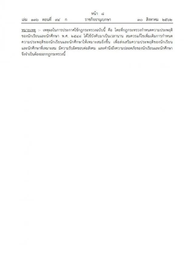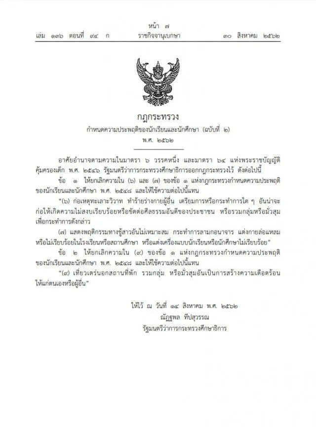 เมื่อวันที่ 30 ส.ค. เว็บไซต์ราชกิจจานุเบกษาเผยแพร่ประกาศ กฎกระทรวงกำหนดความประพฤติของนักเรียนและนักศึกษา (ฉบับที่2)พ.ศ.2562 อาศัยอำนาจตามความในมาตรา 6 วรรคหนึ่งและมาตรา 64 แห่งพระราชบัญญัติคุ้มครองเด็ก พ.ศ. 2546 รัฐมนตรีว่าการกระทรวงศึกษาธิการ ออกกฎกระทรวงไว้ดังต่อไปนี้