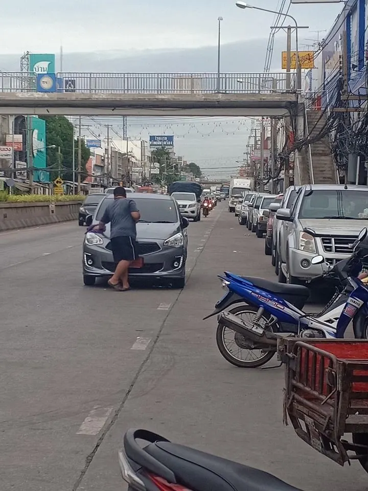 ชายคนหนึ่งกำลังเช็ดรถกระจกรถของตัวเอง ทั้งๆ ที่เวลานั้นรถคันดังกล่าวจอดอยู่กลางถนน โดยภาพดังกล่าวถูกเผยแพร่ผ่านเพจเฮีย