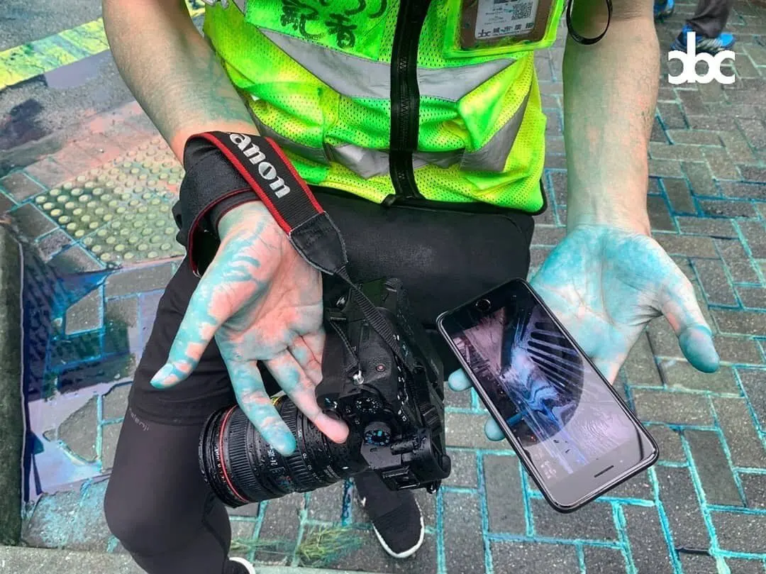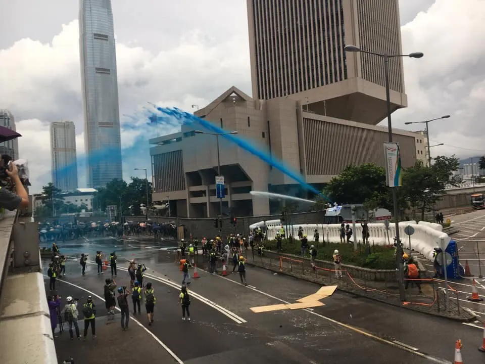 ตำรวจฮ่องกงพ่นน้ำผสมสีที่ล้างไม่ออกใส่ผู้ชุมนุม เนื่องจากผู้ชุมนุมใส่หมวกคลุมและอื่นๆ ทำให้ระบุตัวไม่ได้ การฉีดสีจะทำให้ระบุตัวได้ว่าใครมาชุมนุมบ้างเพื่อไปจับกุมภายหลัง