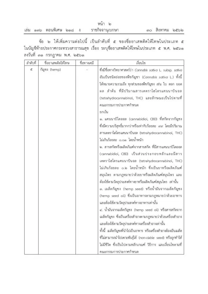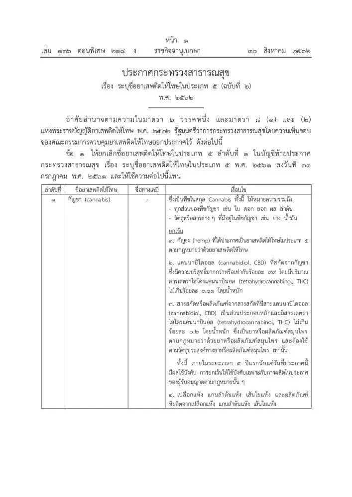 31 สิงหาคม เว็บไซต์ราชกิจจานุเบกษา เผยแพร่ประกาศกระทรวงสาธารณสุข เรื่อง ระบุชื่อยาเสพติดให้โทษในประเภท 5 (ฉบับที่ 2) พ.ศ.2562 โดยสาระสำคัญ ของการยกเว้นไม่เป็นยาเสพติดให้โทษประเภทที่ 5 ของกัญชา กัญชง