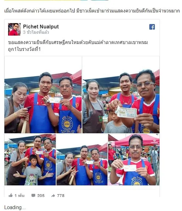 เสร็จสิ้นแล้ว ผู้ใช้เฟซบุ๊ก Pichet Nualput ได้โพสต์รูปภาพผู้โชคดี เป็นแม่ค้าตลาดเทศบาลเขาพนม จ.กระบี่