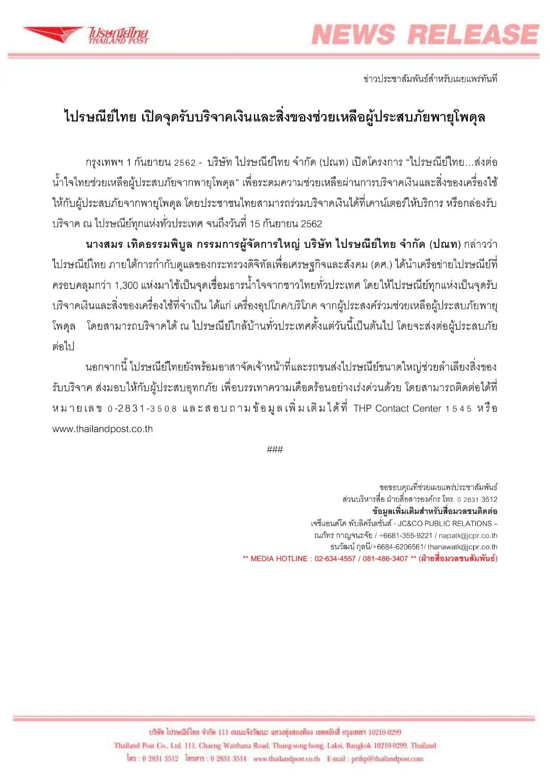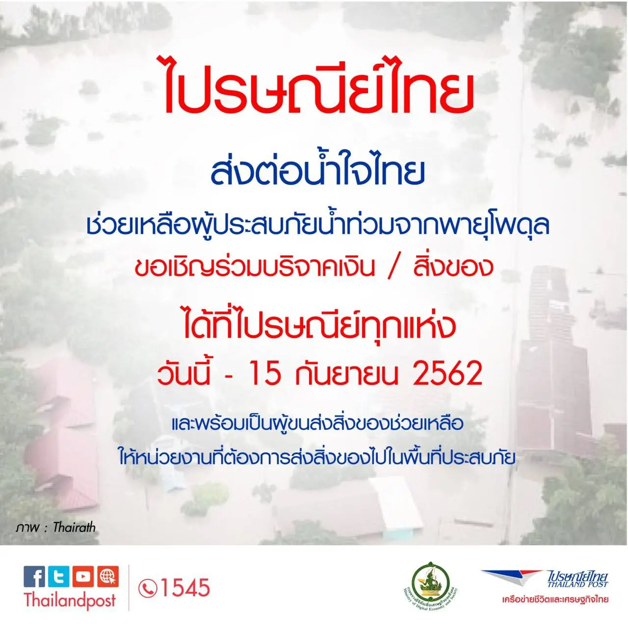 กรุงเทพฯ 1 กันยายน 2562 - บริษัท ไปรษณีย์ไทย จำกัด (ปณท) เปิดโครงการ “ไปรษณีย์ไทย…ส่งต่อน้ำใจไทยช่วยเหลือผู้ประสบภัยจากพายุโพดุล” เพื่อระดมความช่วยเหลือผ่านการบริจาคเงินและสิ่งของเครื่องใช้ให้กับผู้ประสบภัยจากพายุโพดุล โดยประชาชนไทยสามารถร่วมบริจาคเงินได้ที่เคาน์เตอร์ให้บริการ หรือกล่องรับบริจาค ณ ไปรษณีย์ทุกแห่งทั่วประเทศ จนถึงวันที่ 15 กันยายน 2562