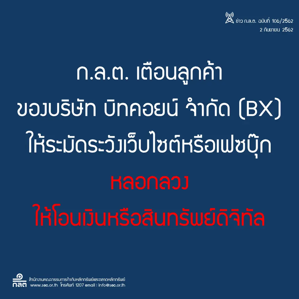 ทั้งนี้ ก.ล.ต. ได้โพสท์เฟซบุ๊ก เตือนลูกค้าของบริษัท บิทคอยน์ จำกัด (BX) ให้ระมัดระวังเว็บไซต์หรือเฟซบุ๊กหลอกลวงให้โอนเงินหรือสินทรัพย์ดิจิทัล