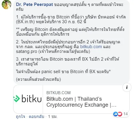 ตามที่บริษัท บิทคอยน์ จำกัด (BX) ประกาศ เมื่อวันที่ 2 กันยายน 2562 เวลา 6.06 น. ว่าบริษัท บิทคอยน์ จำกัด ได้ตัดสินใจยุติบทบาทการประกอบธุรกิจเป็นศูนย์ซื้อขายสินทรัพย์ดิจิทัล หรือการให้บริการด้านกระเป๋าเงินอิเล็กทรอนิกส์ (Digital Asset Wallet) โดยภายหลังจากวันที่ 30 กันยายน 2562 ลูกค้าจะไม่สามารถทำการซื้อขายแลกเปลี่ยน (เทรดดิ้ง) รายละเอียดตาม https://bx.in.th/ นั้น