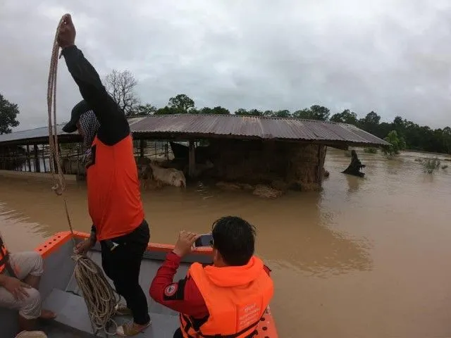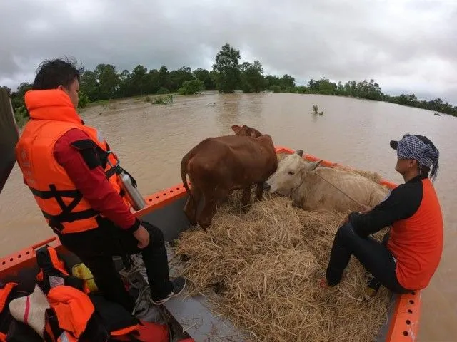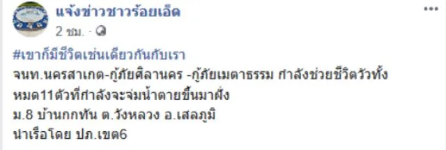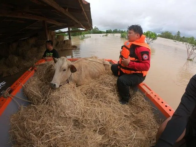 ภาคอีสานอ่วม ฝนตกต่อเนื่อง ทำให้น้ำท่วมหลายจังหวัดในภาพอีสาน เมื่อวันที่ 2 กันยายน เพจ แจ้งข่าวชาวร้อยเอ็ด ได้โพสต์ข้อความระบุว่า เขาก็มีชีวิตเช่นเดียวกันกับเรา จนท.นครสาเกต-กู้ภัยศิลานคร -กู้ภัยเมตาธรรม กำลังช่วยชีวิตวัวทั้งหมด11ตัวที่กำลังจะจมน้ำตายขึ้นมาฝั่ง ม.8 บ้านกกทัน ต.วังหลวง อ.เสลภูมิ นำเรือโดย ปภ.เขต6