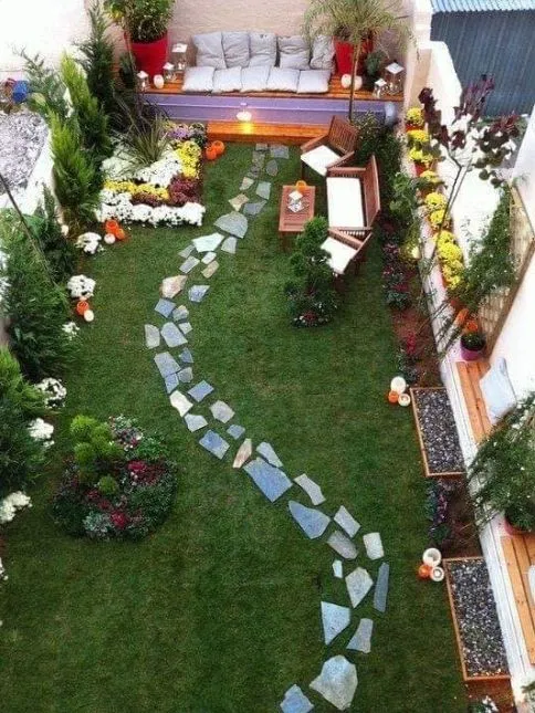แบบร่มรื่น มองมาเขียวด้วยพื้นหญ้า ผ่อนคลายสบายหลังจากทำงานมา เพิ่มเสน่ห์ด้วยหินลายต่างๆ ปรับลายออกไป ดอกไม้สีต่างสำหรับท่านที่ชอบชมดอกไม้