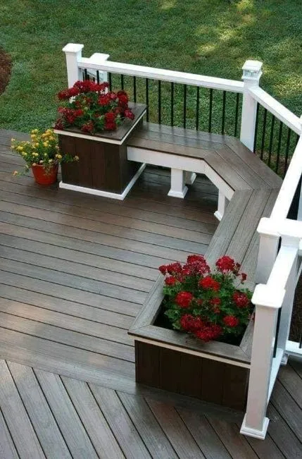 ถึงแม้จะเป็นมุมเล็กๆ แต่ก็สร้างความลงตัวด้วยสีของพื้นแนวไม้ รั้วกั้นไม้ใช้สีขาวสะอาดตา รอบล้อมด้วยกระถางดอกไม้