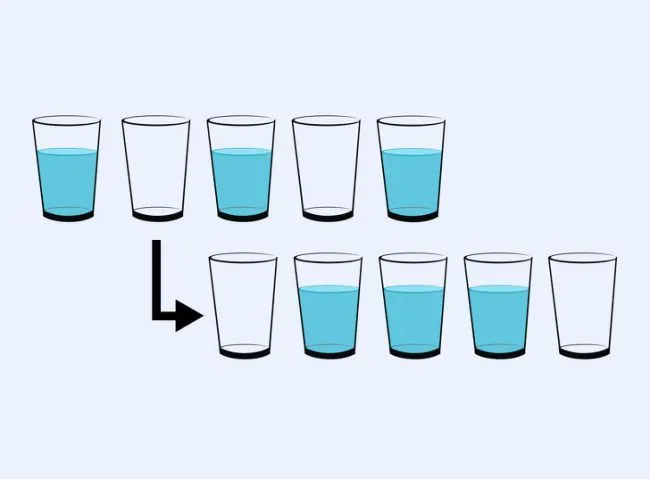 ย้ายแก้วเดียวฝั่งซ้ายแล้วเทน้ำใส่ไว้แก้วกลางแล้วย้ายไปอีกฝั่งหนึ่ง