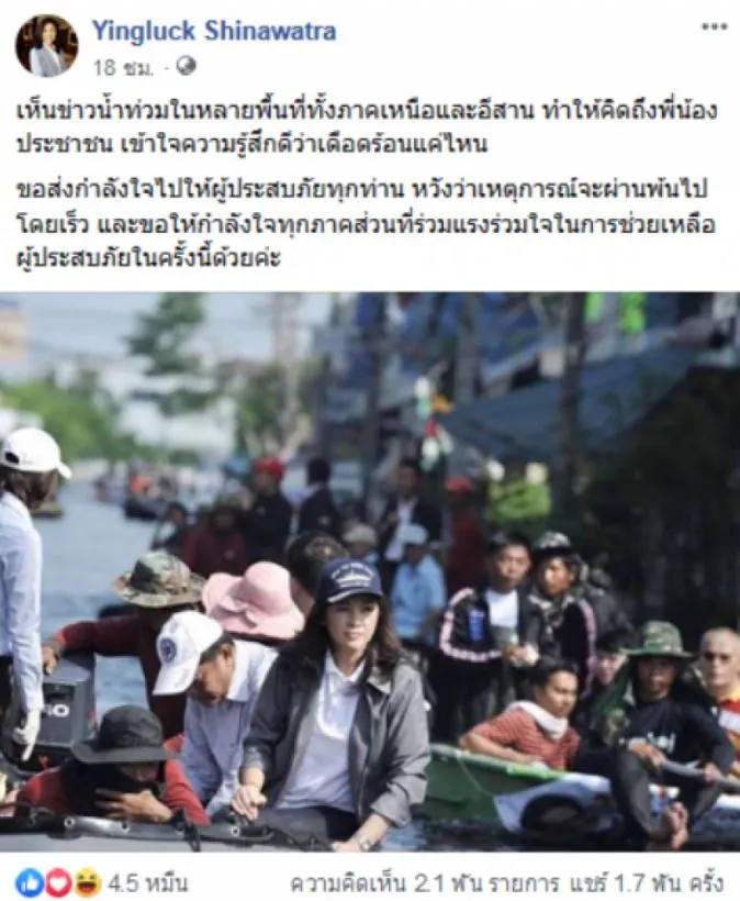 คุณยิ่งลักษณ์ ชินวัตร อดีตนายกรัฐมนตรี โพสต์ผ่านเฟซบุ๊ค เมื่อวันที่ 2 กันยายนที่ผ่านมา ให้กำลังใจผู้ประสบภัยน้ำท่วมในภาคเหนือและภาคตะวันออกเฉียงเหนือ ว่าตนเข้าใจดีว่าประชาชนกำลังรู้สึกเดือดร้อนแค่ไหน ซึ่งคุณยิ่งลักษณ์ได้โพสต์ใจความว่า…