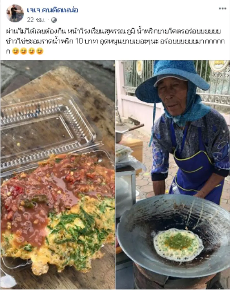 เรียกได้ว่าเป็นอีกหนึ่งเรื่องราวที่กำลังถูกแชร์ กันอย่างมากบนโลกโซเชียล สำหรับเรื่องราวของเพจผู้ใช้เฟซบุ๊กชื่อ เจเจ คนติดเหน่อ ได้ออกมาโพสต์รูปภาพพร้อมข้อความสุดประทับใจ เกี่ยวกับ กับข้าวไข่ชะอมราดน้ำพริก ในราคากล่องละ 10 บาท เท่านั้น ที่แทบไม่อยากเชื่อว่าจะพบเห็นได้ในยุคปัจจุบัน ในยุคเศรษฐกิจแบบนี้ ในภาพจะเห็นคุณยายยืนทอดไข่ อยู่บริเวณรั่วโรวเรียนสุพรรณภูมิ โดยได้โพสต์ข้อความระบุว่า ผ่านไม่ได้เลยต้องกิน หน้าโรงเรียนสุพรรณภูมิ น้ำพริกยายโคตรอร่อย ข้าวไข่ชะอมราดน้ำพริก 10 บาท อุดหนุนยายเยอะๆนะ อร่อยมาก