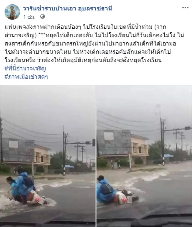 แฟนเพจส่งภาพฝากเตือนน้องๆ ไปโรงเรียนในเขตที่มีน้ำท่วม (จากอำนาจเจริญ)