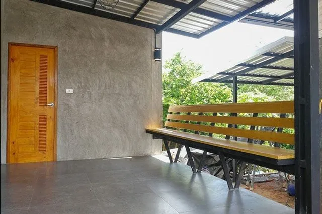 โครงสร้างของบ้านเป็นเหล็กทั้งหมด หลังคาเป็นทรงแหงนตามฉบับบ้านโมเดิร์น บริเวณระเบียงต่อชายคาออกมาเพื่อกันฝน อีกด้านของระเบียงได้ทำม้านั่งแบบมีพนักพิงไว้ด้วย