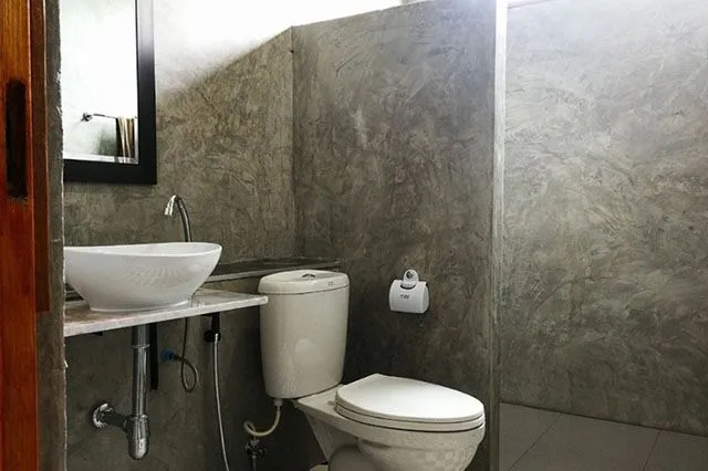 ส่วนห้องน้ำพื้นปูด้วยกระเบื้องโทนสีเทา มีการกั้นที่อาบน้ำกับส่วนที่เป็นชักโครก อ่างล้างหน้ารูปทรงสวยงาม เรียบหรูมาก