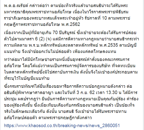 ล่าสุดสื่อดังเผยข่าว ...3 ก.ย. พ.ต.อ.ณรัชต์ เศวตนันทน์ อธิบดีกรมราชทัณฑ์ กล่าวว่า ทัณฑสถานโรงพยาบาลราชทัณฑ์ได้ทำการปล่อยตัว นายสนธิ ลิ้มทองกุล อายุ 72 ปี ผู้ต้องขังชั้นเยี่ยม ที่ต้องคดีความผิดเกี่ยวกับ กฎหมายหลักทรัพย์และตลาดหลักทรัพย์ และอื่นๆ ซึ่งรับโทษมาแล้ว 3 ปี 1 เดือน