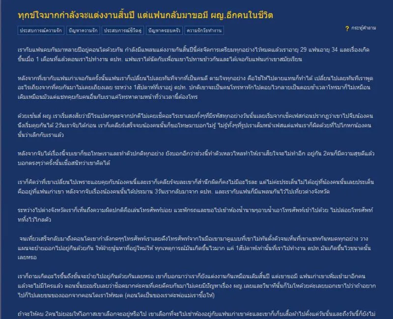 สมาชิกหมายเลข 5486192 ได้ตั้งกระทู้ ทุกข์ใจมากกำลังจะแต่งงานสิ้นปี แต่แฟนกลับมาขอมี ผู้หญิงอีกคนในชีวิต โดยมีใจความสรุปดังนี้ เจ้าของกระทู้อายุ 29 ปี ว่าที่สามีอายุ 34 ปี ทั้งคู่ตัดสินใจอยู่ด้วยกัน และมีแผนจะแต่งงานกันปลายปีนี้