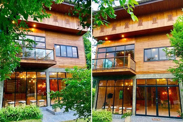 โดยลักษณะเป็นบ้านสองชั้น ชั้นบนส่วนใหญ่เป็นไม้ ชั้นล่างเป็นผนังปูน มองจากภายนอกแล้ว ก็คล้ายรูปแบบบ้านไทย มีต้นไม้ใหญ่น้อย ดูร่มรื่น เย็นสบายชั้นล่างด้านหน้าเป็นกระจกทั้งหมด เพิ่มความทันสมัย ด้านบนมีระเบียงสำหรับชมวิว หน้าต่างและทางไประเบียงก็เป็นหน้าต่าง ซึ่งเมื่อได้เดินเข้ามาภายในบริเณของบ้านหลังนี้แล้ว สิ่งที่สัมผัสได้ครั้งแรกเลยคือความร่มรื่น ภายในพื้นที่บ้าน โดยข้อดีของการปลูกต้นไม้ยืนต้น ภายในบริเวณบ้านจะให้ความรู้สึกแบบนี้