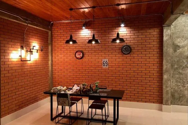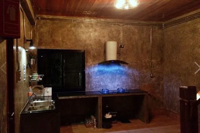 ผนังห้องครัวยังคงเป็นปูนแบบบ้านสไตล์ลอฟท์ ห้องครัวกว้างขวาง สะดวกเวลาทำกับข้าว ชั้นเตาแก๊ส ซิ้งค์ล้างจานเป็นกระเบื้องสีดำเงา มีตู้สำหรับเก็บอุปกรณ์ต่าง ๆ มีเป็นระเบียบเรียบร้อย ง่ายเวลาหยิบใช้ มีการติดตั้งที่ดูดอากาศ ไม่มีกลิ่นรบกวนเวลาประกอบอาหาร อีกส่วนจัดให้เป็นโต๊ะอาหาร ติดตั้งหลอดไฟที่เป็นได้ทั้งไฟประดับ และให้แสงสว่าง ผนังปูนในส่วนนี้เป็นอิฐมอญ ทีความสวยงามลงตัว