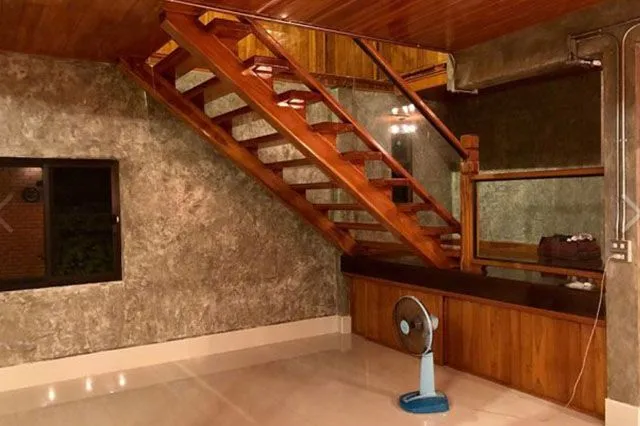 สวยงามสะดุดตา ด้วยบันไดไม้ขึ้นชั้นสอง พื้นปูด้วยกระเบื้องโทนสีชมพูอ่อน ๆ ปูนดิบขัด เข้ากัน ลงตัวมาก