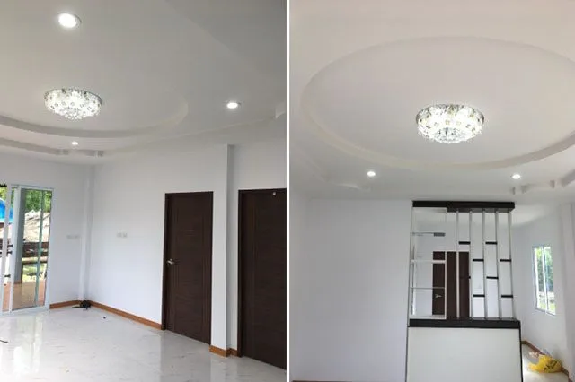 ภาพรวมส่วนต่าง ๆ ของตัวบ้าน เสาหน้าบ้านโทนสีส้ม พร้อมติดไฟประดับ ห้องโถงรับแขกมีฝ้าหลุมวงกลม ประดับด้วยไฟสวย ๆ มีไม้ระแนงกั้นสวยงามไม่เหมือนใคร ภายในตัวบ้านทาด้วยสีขาว กระเบื้องก็โทนสีขาว ทำให้บ้านดูสะอาดสะอ้าน รู้สึกได้ถึงอารมณ์ ความสงบร่มเย็นภายในตัวบ้าน ทำให้ดูน่าอยู่มาก