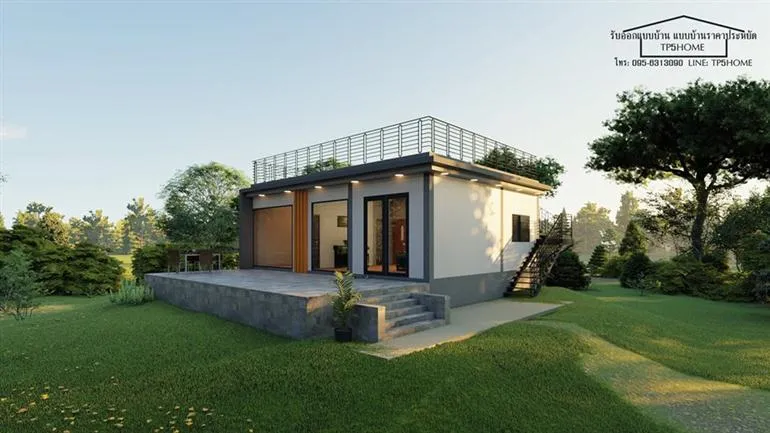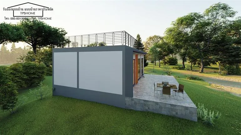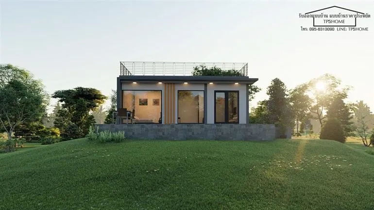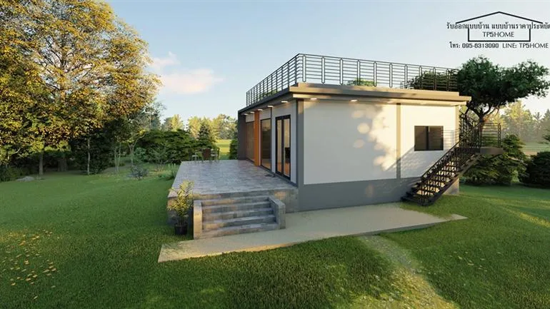 โดดเด่นด้วยดาดฟ้าด้านบน เหมาะกับครอบครัวเริ่มต้นยังคงมีแบบบ้านสวยๆ มาแนะนำให้ทุกท่านได้ดูได้เลือกไปไว้สร้างบ้านจากเพจ TP5HOME ที่รับออกแบบบ้าน และมีแบบบ้านราคาประหยัดให้เลือก กันเช่นเคยนะครับ โดยหลังนี้เป็นแบบบ้านชั้นเดียวทรงสี่เหลี่ยมง่ายๆ แต่ไม่ธรรมดาด้วยการยกฐานขึ้นเล็กน้อย พร้อมกับเฉลียงหน้าบ้านเล็กๆ เป็นพื้นที่นั่งเล่นในครอบครัว นอกจากนี้ชั้นบนไม่มีหลังคา แต่ออกแบบให้เป็นดาดฟ้าทั้งหมด ไว้นั่งกินลมเย็นๆ อีกต่างหาก การตกแต่งและสีสันก็มาในแบบโมเดิร์นสมัยใหม่