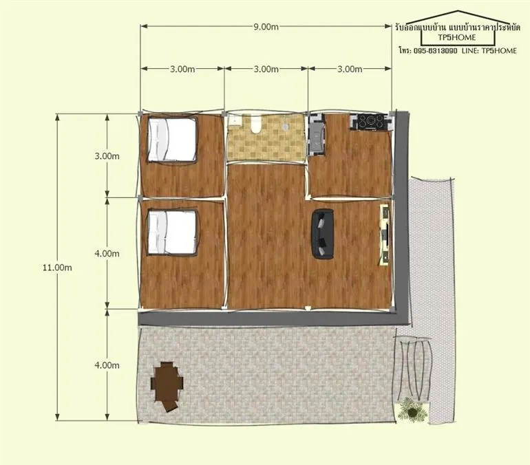 ตัวบ้านมีขนาด 2 ห้องนอน 1 ห้องน้ำ 1 ห้องรับแขก/โถง 1 ครัว ขนาดตัวบ้านอยู่ที่ 9 X 7 เมตร ราคาก่อสร้างคร่าวๆ อยู่ที่ราว 6.8 แสนบาทเท่านั้น จัดว่าลงตัวเลยทีเดียวครับ