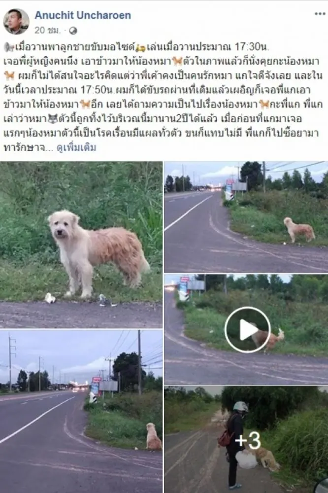 ผู้ใช้เฟซบุ๊ก Anuchit Uncharoen ได้โพสต์เรื่องราวของสุนัขตัวหนึ่ง ที่ถูกทิ้งข้างทางนานกว่า 2 ปี ไม่ยอมไปไหน แม้จะมีคนเอาไปเลี้ยง มันก็ยังกลับมารออยู่เดิมทุกๆ วัน ซึ่งผู้โพสต์เล่าว่า