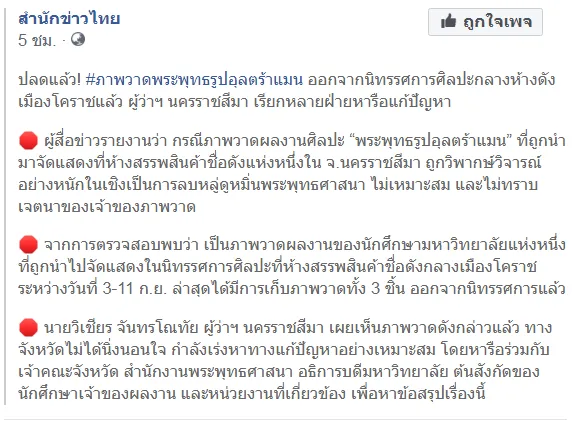 ล่าสุดเพจ สำนักข่าวไทย ได้โพสท์รายงานว่า ...ปลดแล้ว! #ภาพวาดพระพุทธรูปอุลตร้าแมน ออกจากนิทรรศการศิลปะกลางห้างดังเมืองโคราชแล้ว ผู้ว่าฯ นครราชสีมา เรียกหลายฝ่ายหารือแก้ปัญหา เป็นการลบหลู่ดูหมิ่นพระพุทธศาสนา ไม่เหมาะสม