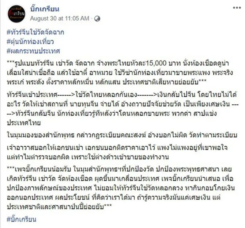 จากกรณีเมื่อวันที่ 30 สิงหาคม 2562 เพจ บิ๊กเกรียน ได้เปิดโปงแก๊งทัวร์จีน ที่เช่าวัดไทย จัดฉากให้เช่าเครื่องรางของขลังแก่ทัวร์จีน และมีการจ้างพระสงฆ์ไทยในราคารูปละ 15 000 บาท เพื่อสร้างความน่าเชื่อถือ สร้างความเสียหายให้กับไทยเป็นอย่างมาก
