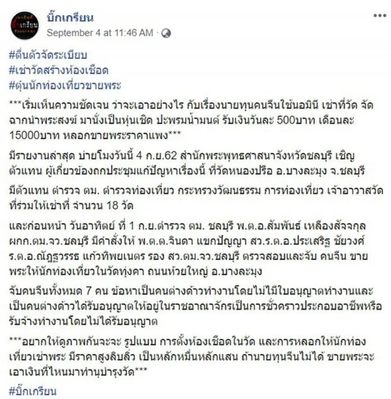 ทางเพจระบุว่า สำนักพุทธศาสนามองว่าไม่เป็นความผิด เพราะทำตามระเบียบคณะสงฆ์ แม้เจ้าอาวาสจะยินยอมให้เอกชนเช่า แต่มุมมองของเจ้าหน้าที่ตำรวจนับว่ามีความผิด เพราะผู้ที่ทำมาค้าขายคือชาวต่างชาติ