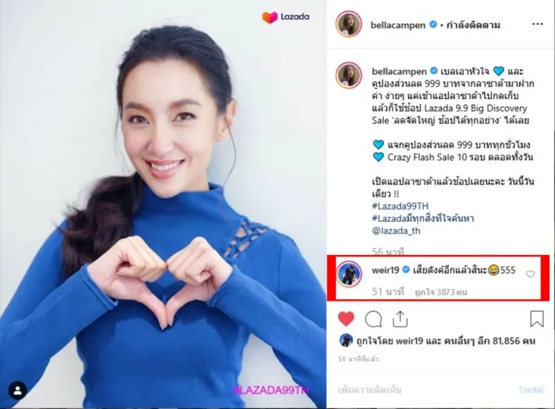 โพสต์ล่าสุดเบลล่า แต่งานนี้เวียร์โผล่คอมเม้นท์ทันที