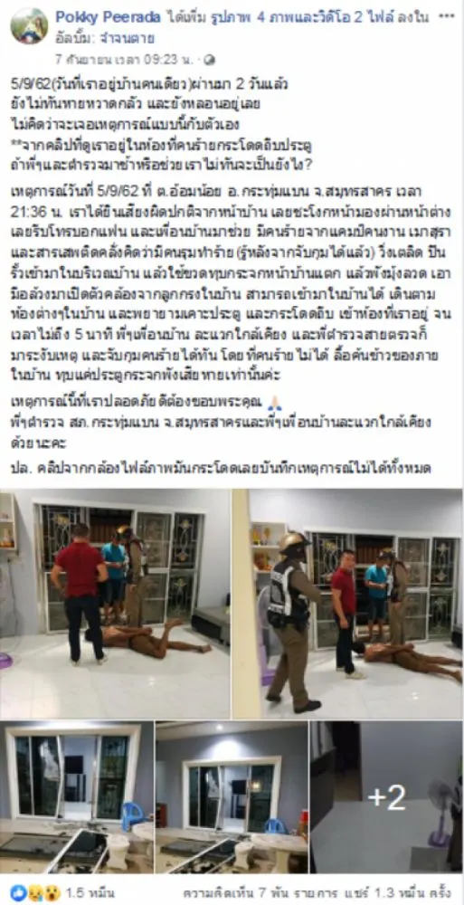 เหตุการณ์วันที่ 5/9/62 ที่ ต.อ้อมน้อย อ.กระทุ่มแบน จ.สมุทรสาคร เวลา 21:36 น. เราได้ยินเสียงผิดปกติจากหน้าบ้าน เลยชะโงกหน้ามองผ่านหน้าต่าง เลยรีบโทรบอกแฟน และเพื่อนบ้านมาช่วย มีคนร้ายจากแคมป์คนงาน คลั่งคิดว่ามีคนรุมทำร้าย(รู้หลังจากจับกุมได้แล้ว) วิ่งเตลิด ปีนรั้วเข้ามาในบริเวณบ้าน แล้วใช้ขวดทุบกระจกหน้าบ้าน แล้วพังมุ้งลวด เอามือเข้ามาเปิดตัวคล้องจากลูกกรงในบ้าน สามารถเข้ามาในบ้านได้ เดินตามห้องต่างๆในบ้าน และเคาะประตู และกระโดด เข้าห้องที่เราอยู่ จนเวลาไม่ถึง 5 นาที พี่ๆเพื่อนบ้าน ละแวกใกล้เคียง และพี่ตำรวจสายตรวจก็มาระงับเหตุ และจับกุมคนร้ายได้ทัน โดยที่คนร้ายไม่ได้ ลื้อค้นข้าวของภายในบ้าน ทุบแค่ประตูกระจกพังเสียหายเท่านั้นค่ะ