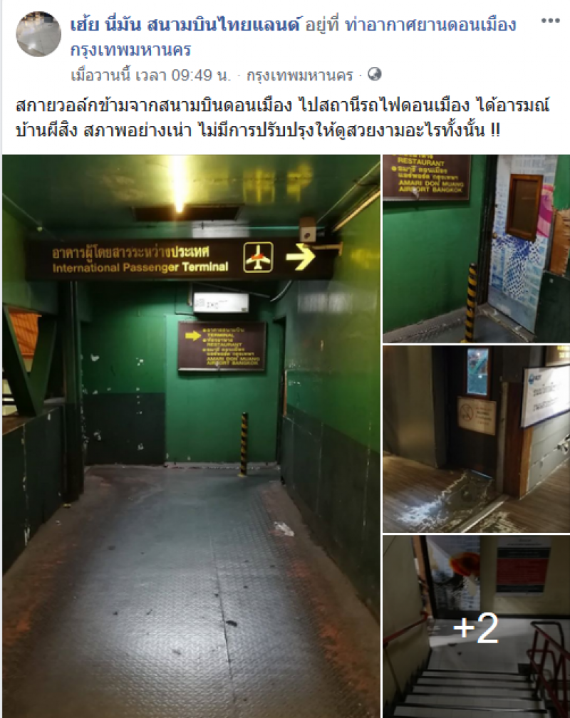 โดยล่าสุด ภาพที่ได้รับการแชร์อย่างหนัก เป็นภาพของบริเวณสกายวอล์กข้ามจากสนามบินดอนเมือง ไปสถานีรถไฟดอนเมือง ซึ่งสะพานดังกล่าวเชื่อมออกมาจากสนามบิน และใช้งานมาเป็นเวลานาน พบว่า สภาพของบริเวณทางเชื่อม ชำรุด ทรุดโทรมอย่างหนัก โดยมีภาพความชำรุดหลายจุดด้วยกัน โดยส่วนใหญ่อย่างให้มีการปรับปรุงให้อยู่ในสภาพที่ดีกว่านี้