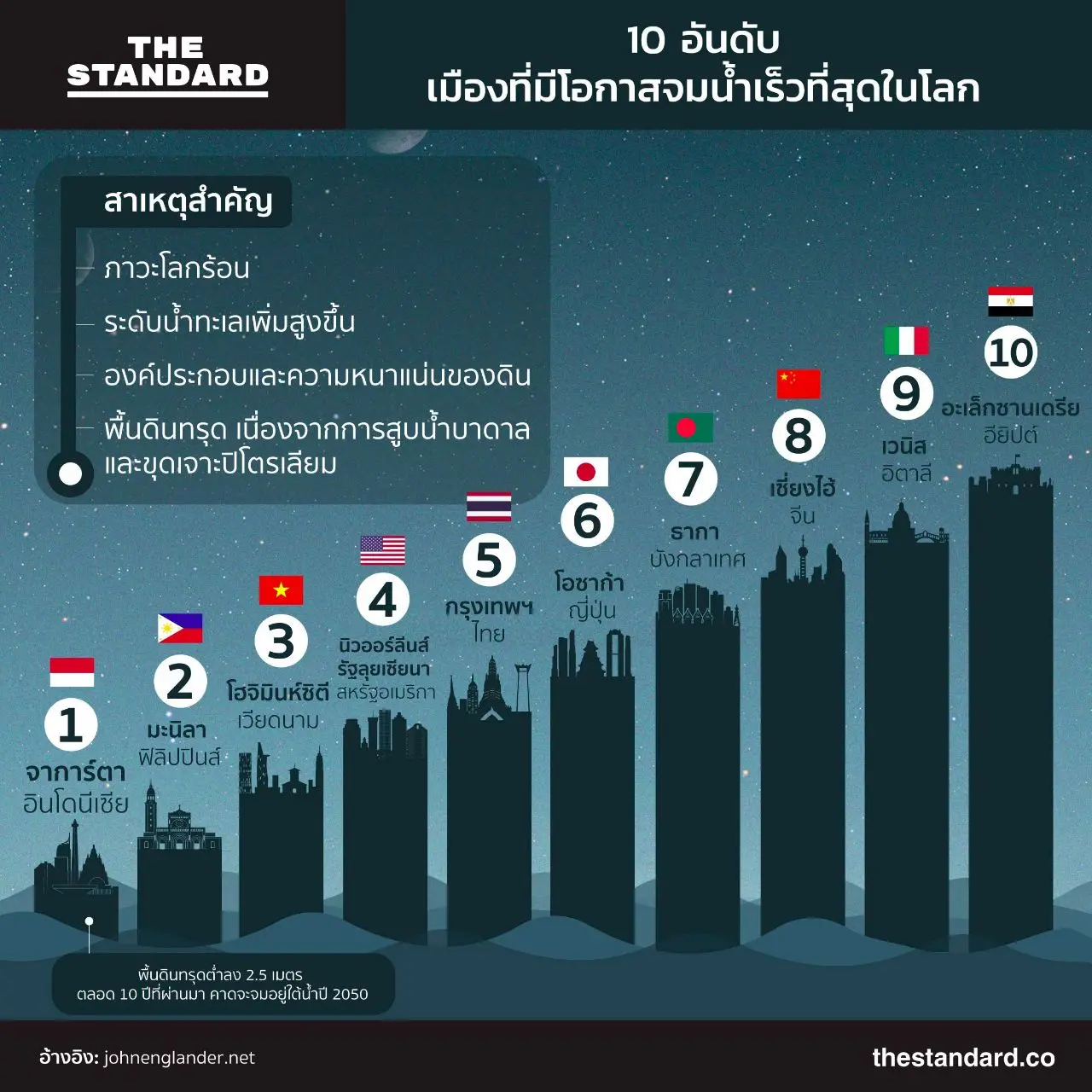 หลายเมืองทั่วโลกกำลังประสบปัญหาพื้นดินทรุดครั้งใหญ่ ประกอบกับระดับน้ำทะเลเพิ่มสูงขึ้น เพิ่มความเสี่ยงในการจมลงอยู่ใต้น้ำในอนาคตอันใกล้ และนี่คือ 10 อันดับเมืองที่มีโอกาสจมน้ำเร็วที่สุดในโลก จากการสำรวจและเก็บข้อมูลของ จอห์น อิงก์แลนเดอร์ ผู้เชี่ยวชาญด้านระดับความสูงของน้ำทะเล