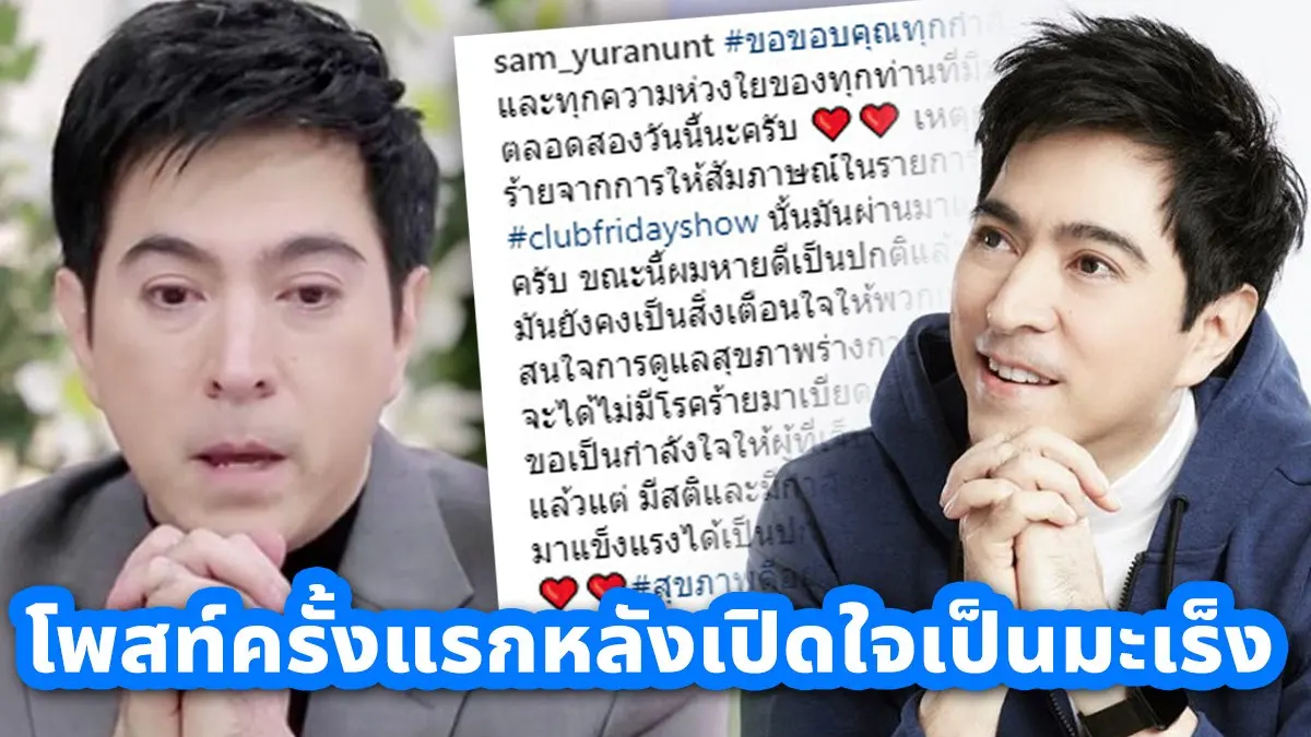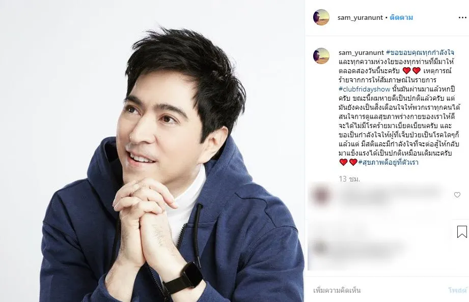 ล่าสุดใน sam_yuranunt #ขอขอบคุณทุกกำลังใจ และทุกความห่วงใยของทุกท่านที่มีมาให้ตลอดสองวันนี้นะครับ เหตุการณ์ร้ายจากการให้สัมภาษณ์ในรายการ #clubfridayshow นั้นมันผ่านมาแล้วหกปีครับ ขณะนี้ผมหายดีเป็นปกติแล้วครับ แต่มันยังคงเป็นสิ่งเตือนใจให้พวกเราทุกคนได้สนใจการดูแลสุขภาพร่างกายของเราให้ดี จะได้ไม่มีโรคร้ายมาเบียดเบียนครับ และขอเป็นกำลังใจให้ผู้ที่เจ็บป่วยเป็นโรคใดๆก็แล้วแต่ มีสติและมีกำลังใจที่จะต่อสู้ให้กลับมาแข็งแรงได้เป็นปกติเหมือนเดิมนะครับ #สุขภาพดีอยู่ที่ตัวเรา