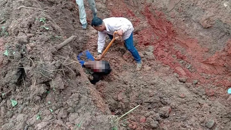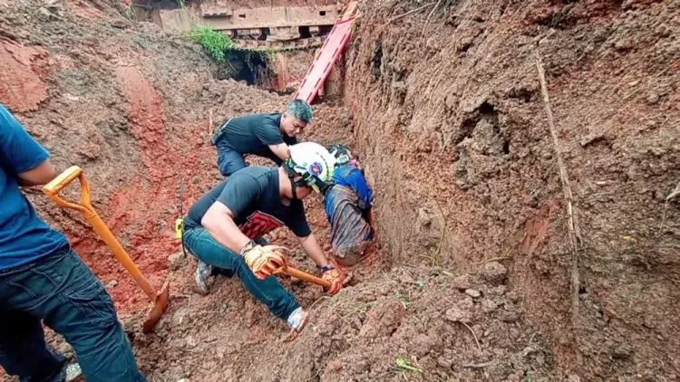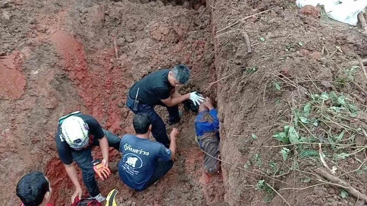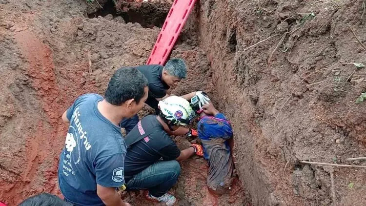 นาทีชีวิต ช่วยคนงานวัย 59 ปี ถูกดินถล่มทับขณะกำลังขุดดินเตรียมวางท่อระบายน้ำ