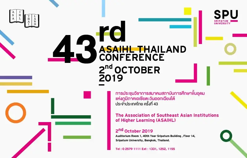 มหาวิทยาลัยศรีปทุม ได้รับเกียรติจาก สมาคมสถาบันการศึกษาขั้นอุดมแห่งภูมิภาคเอเชียตะวันออกเฉียงใต้ ประเทศไทย (สออ.ประเทศไทย) เป็นเจ้าภาพจัดการประชุมทางวิชาการระดับชาติ การประชุมวิชาการสมาคมสถาบันการศึกษาขั้นอุดมแห่งภูมิภาคเอเชียตะวันออกเฉียงใต้ ประจำประเทศไทย ครั้งที่ 43 (The 43rd ASAIHL Thailand Conference: The Association of Southeast Asian Institutions of Higher Learning: ASAIHL) Theme: Revitalizing Higher Education for Sustainable Development วันที่ 2 ตุลาคม 2562 เวลา 09.00 – 16.30 น. ณ Auditorium 1 ชั้น 14 อาคาร 40 ปี ศรีปทุม มหาวิทยาลัยศรีปทุม กทม. ทั้งนี้เปิดให้ผู้สนใจส่งต้นฉบับบทความวิจัย บทความวิชาการ เข้าร่วมนำเสนอในการประชุมฯ ส่งผลงานได้ตั้งแต่วันนี้จนถึงวันศุกร์ที่ 13 กันยายน 2562 คลิกลงทะเบียนและดูกำหนดการที่นี่ The 43rd ASAIHL Thailand Conference