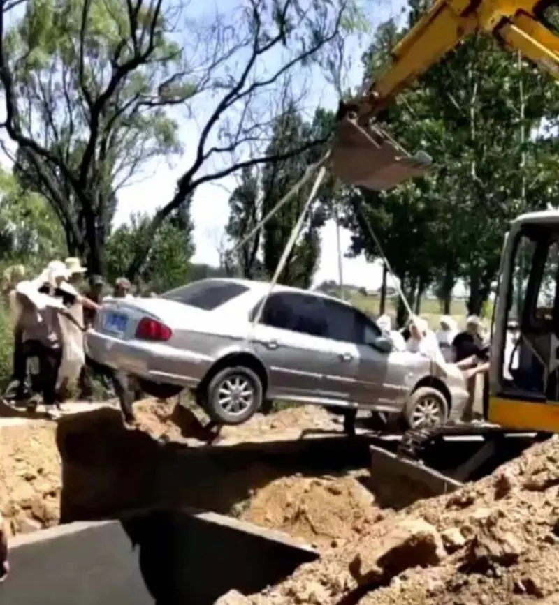 เผยให้เห็นรถตักดินค่อยๆ หย่อนรถเก๋งสีเทารุ่นเก่าลงในหลุมสี่เหลี่ยม ท่ามกลางเสียงดนตรีและปะทัดของพิธีฝังศพตามธรรมเนียมจีน