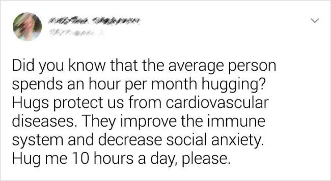 คุณรู้ไหมว่าผู้คนใช้เวลาเฉลี่ยในการกอด 1 ชั่วโมงต่อเดือน การกอดปกป้องเราจากโรคหัวใจและหลอดเลือด (Cardiovascular Disease) มันคือระบบภูมิคุ้มกันทั้งหมดของร่างกายและลดโรคหวาดกลัวการเข้าสังคม กอดฉันสัก 10 ชั่วโมงต่อวันนะ