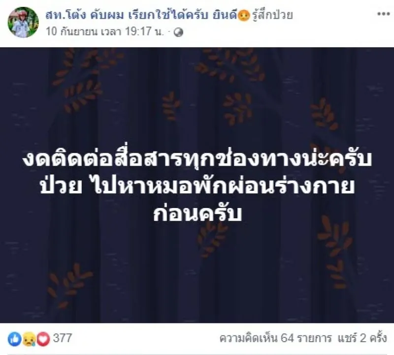 ทั้งนี้หากย้อนกลับไปทางเฟซบุ๊กส่วนตัวของคุณดำรงศักดิ์ เจียดประโคน กู้ภัยฮีโร่ ก็โพสต์สุดท้ายไว้ว่า งดติดต่อสื่อสารทุกช่องทางน่ะครับ ป่วย ไปหาหมอพักผ่อนร่างกายก่อนครับ