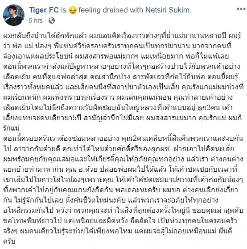 ทั้งนี้ เสือ ได้ระบุว่า ตนอยากฝากบอกถึงคนที่มาสร้างบาปให้กับครอบครัว ได้แก่ คนที่ดูแลพ่อก่อนหน้านี้ รังแกพ่อ อีกรายเป็นเสี่ยรายหนึ่ง รังแกแม่ในช่วงที่ตนไปเรียนหนักที่ต่างประเทศ ให้มาเคลียร์หนี้สินและจบกันไป และอีกคน คุณ อ. ให้ปล่อยพ่อตนไปได้แล้ว ให้พ่อกลับมาใช้ชีวิต เอาเวลากลับใส่ใจน้อง ๆ หลังจากมาทำให้พ่อต้องทิ้งน้อง ๆ ไปและคุณ อ. กีดกันพ่อไม่ให้มาเจอน้อง ๆ อยากให้เลิกยุ่งเกี่ยวต่างคนต่างอยู่ จะให้อภัยและอโหสิกรรมให้