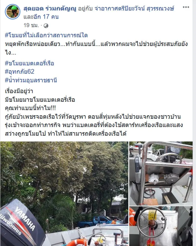 จากกรณี สมาชิกเฟซบุ๊ก สุดยอด ร่วมกตัญญู ซึ่งลงพื้นที่ช่วยเหลือชาวบ้าน ได้โพสต์เหตุการณ์ที่เกิดขึ้น ซึ่งเรือที่เข้าช่วยเหลือชาวบ้านถูกขโมยแบตเตอรีไป ทำให้ไม่สามารถติดเครื่องยนต์ และออกช่วยเหลือชาวบ้านได้ ตามที่เสนอข่าวไปแล้วนั้น อ่านข่าว กู้ภัยโอด ช่วยน้ำท่วม หยุดพักแค่นิดเดียวโดนขโมยแบตเรือไปต่อไม่ได้