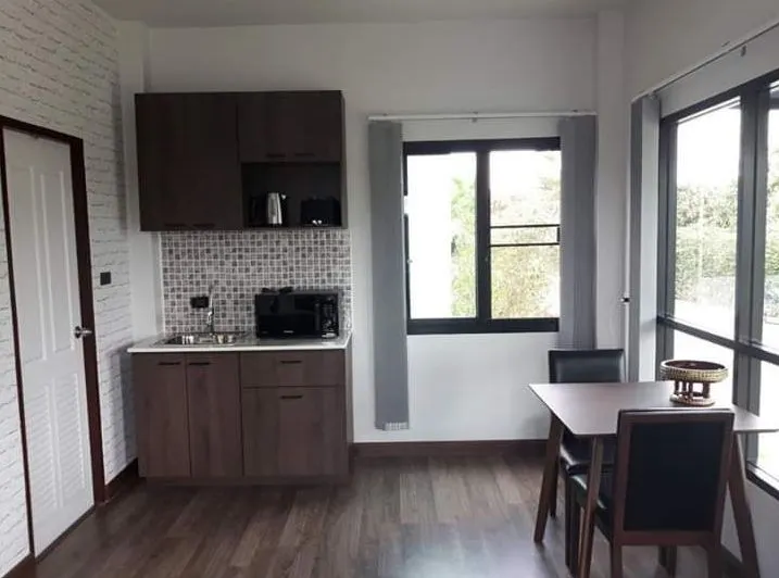 ห้องครัว ปูพื้นด้วยไม้ปาร์เก้เช่นกัน ตกแต่งด้วยการนำวอล์เปเปอร์ มาติดแปะผนัง ทำให้ มีลวดลายที่สวยงามขึ้นมาทันที และแสดงถึงรสนิยมของเจ้าของห้อง ในห้องนี้ยังมีซิ่งล้างถ้วย พร้อมตู้เก็บอุปกรณ์เครื่องครัว และโต๊ะรับประทานอาหาร ทำให้สะดวกสบาย กับผู้มาพักเป็นอย่างยิ่ง ผู้อ่านรู้สึกอย่างไรกันบ้างครับ กับบ้านที่เพียบพร้อมสวยงาม เล็กๆ ด้วยสิ่งอำนวยความสะดวก ผู้เขียนหวังว่าคงถูกใจหลายๆท่าน นะครับ สำหรับใครที่กำลังมองหา ที่จะประกอบธุรกิจห้องพัก หรือจะสร้างบ้าน ที่ต้องการใช้งบน้อย ก็สามารถนำไปเป็นแบบ เป็นแนวทาง ที่จะสร้าง