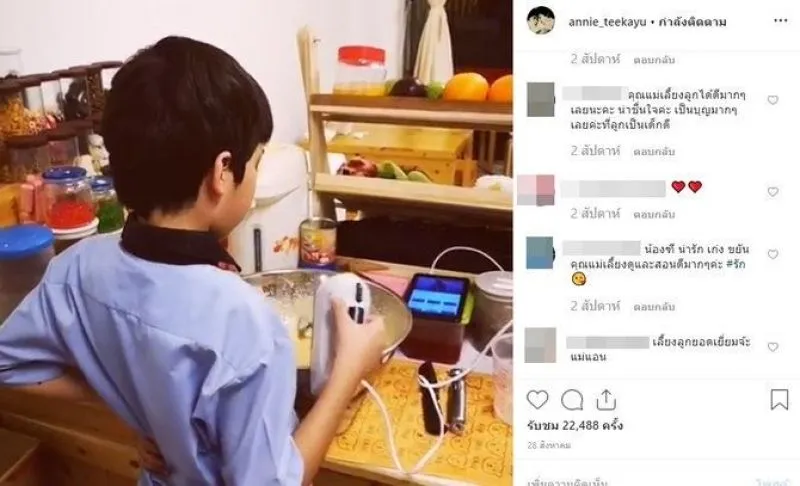 มีแต่คนอยากไปช่วยอุดหนุนฝีมือ แม่แอนนี่และน้องฑีฆายุ และคลิปน่ารักๆ ที่ลูกชายช่วยแม่แอนทำขนม และเขียนแคปชั่นไว้ว่า